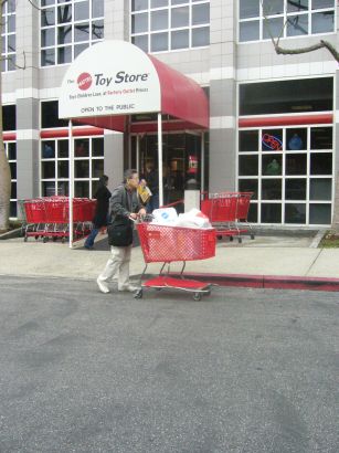 お店の入り口です お買い物いっぱいしたカートをおしている 夫・・・