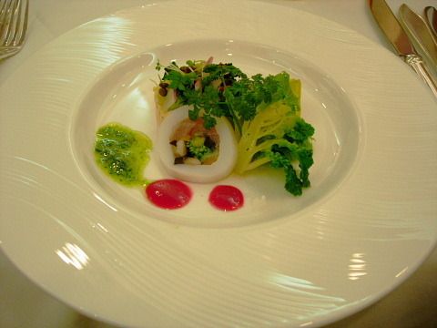 海の幸と野菜を詰めたイカのマーブル仕立て