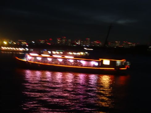 | 夜も暮れてまいりました 他の屋形船もちらほら。。。 7月と8月はディズニーの花火が無いので ちょっと残念ですが また、2年後にでもお船にのって 納涼を楽しみたいと思います