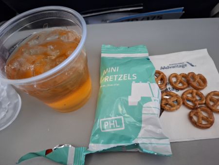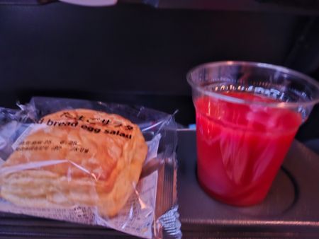 乗ってすぐで ジュースとプレッツェルが提供されますが