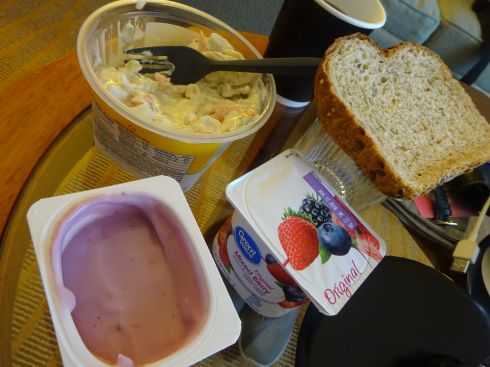 朝食はカニサラダとヨーグルトのみ 夫はパンを一切れプラスして 食べています。