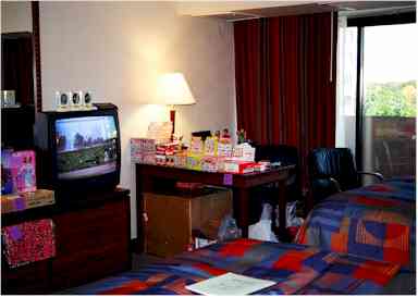 ベッドの上 クローゼットの上 椅子の上 すべて使って ディスプレーしました とは 言っても ダンボール1箱だけの品物なので ちょっとみすぼらしいですが とにかくこれらを 売って ホテル代にするのです ガッツあるのみ! 夜7時過ぎたので そろそろ ファッションショーが始まります 下へ降りようと思います