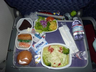 映画を見ている間に もう ディナーが運ばれてきました AAではメニューが配られないので 食事のメニューがはっきりわかりませんので 画像だけ・・・ 左はチキンバージョン 右はビーフバージョンです それにサラダ お寿司 パン クリームチーズ バター チョコレートケーキ がついています 味はかなりおいしいので びっくりしました! ちょっとした レストラン並みの味付けですよ (^-^) そして 食事のあとも映画を見たり うつうつしたりして 時間を過ごします (アリスワンダーランド他2本をしっかり見てしまいました) 今回の飛行機は 席が 2−5−2という配置になっています 真ん中の5席のど真ん中の人は辛いだろうなぁ・・・ トイレに立ちづらいだろうなぁ・・・って もう少し考えた配置にしたらいいと真剣に思ったもので 書いてしまいます。(-_-;) 私個人としては 今回のフライト短く感じました 2人席だし 映画は選べるし クーラーはすごく寒いわけでなく 毛布をかけてちょうどいい位だったので ノンストレス!