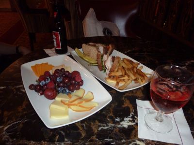 フルーツとチーズの盛り合わせと ターキーの入ったサンドウィッチを頼みます. 飲み物は 無料なのです \(^o^)/ 夫はバドワイザー 私はクランベリージュースを注文です (マリオットホテルのメンバーなので ドリンク無料券をもらいました そのため無料)
