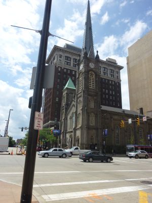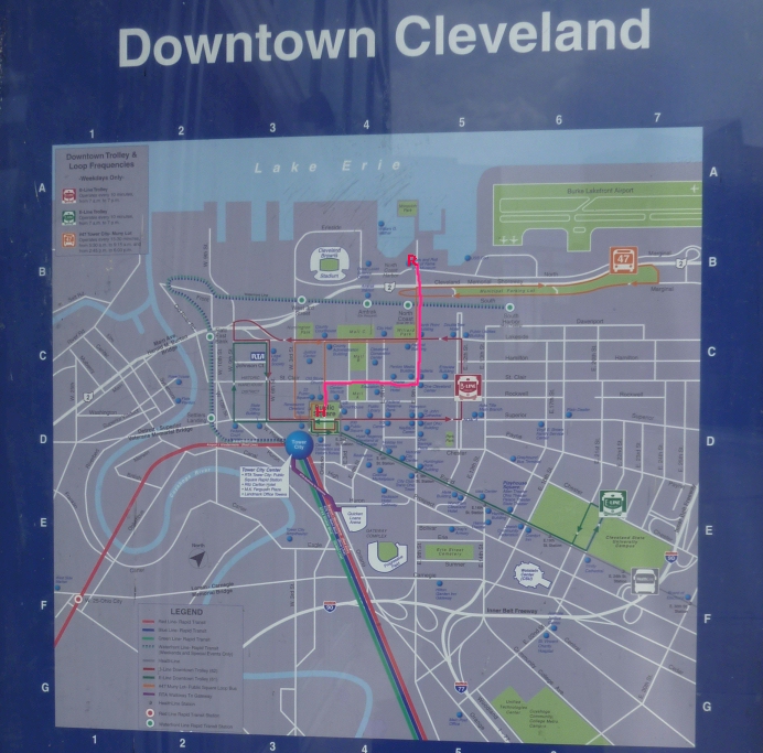 これがクリーブランドの全体図 ピンクの文字でHと入っているところが ホテルです Rと書いてみたところが ロックンロールミュージアムです 歩いて15〜20分という感じです 昼間は観光客が多くて安心して歩けますが 若干 怖い感じの人たちがいたりします・・・