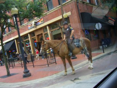 街には馬に乗ったポリスがいます なんか良い感じ (*^_^*) 後ろのお店は ウエスタンルックのお店 看板がすごい!