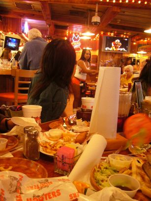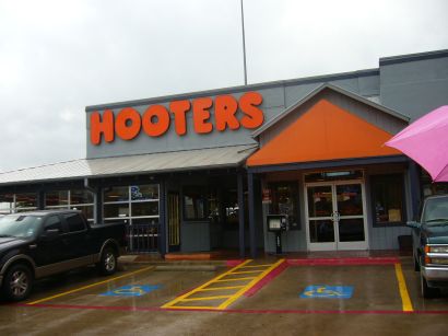 [HOOTERS] というお店です。 ここに着く頃は 雨もほとんど降っていないようになり ほっとひといきです アメリカは車椅子マークには絶対に車を止めません とても そのシステムは 行き届いていて 感心します 日本では このマークの上にどうどうと 若者が車を止めているのを見かけますよね 悲しい現象です。