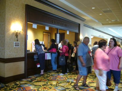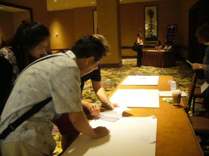 ・・・・と 盛り上がり中 いきなり コンベンションのテーブル番号を控えておかなくてはならないのに 書き忘れてしまっていることに 気が付きました! がぁ〜ん これって最悪じゃない? もう恥ずかし過ぎです・・・ 初心者ではない 気の緩みがでました わぁ〜どうしよう 1000人もの出席者の中から 私達の番号を選ぶのは ものすごく大変だと思います あぁ またまた 「爆ちゃぁ〜ん」 です 係りの人と一緒に テーブル表に書かれた私達の名前を探します