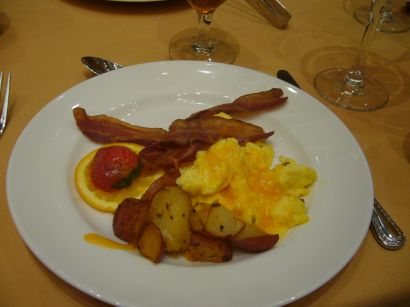 メインディッシュはスクランブルエッグとポテト ベーコン 軽いです。
