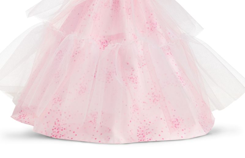 淡いピンクのチュールドレスには紙吹雪のようなデザインをあしらい、