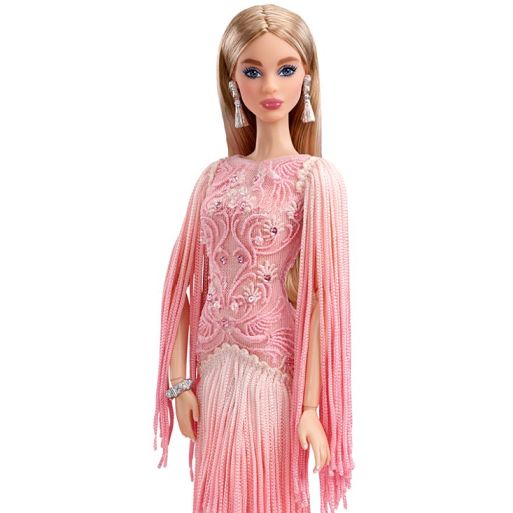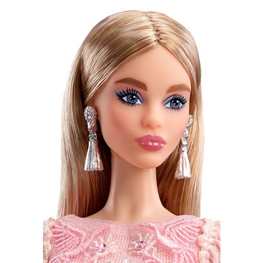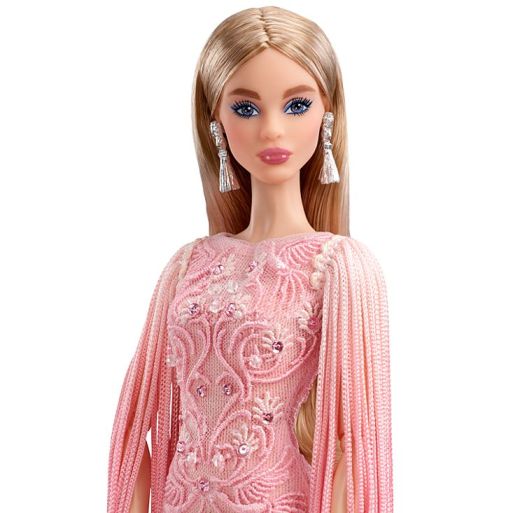Fashion: Blush pink tulle gown featuring embroidered floral and bird motifs on the bodice