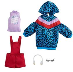 | Barbie Fashions 2-Pack Clothing Set Animal-Print Hoodie Dress, Graphic Top, Red Overalls |