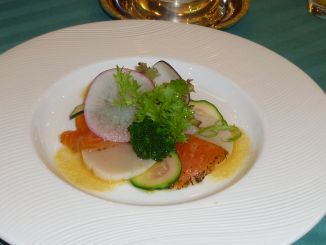 Carpaccio de Saumon Mariné a lÁneth. Coquille Saint-Jacques au Poivre Cédrat. Sauce Vinaigrette à lÓrange avec Salade aux Herbes. サーモンのディル風味とホタテ貝の柚子胡椒風味マリネ オレンジのヴィネグレットソース ハーブサラダを添えて