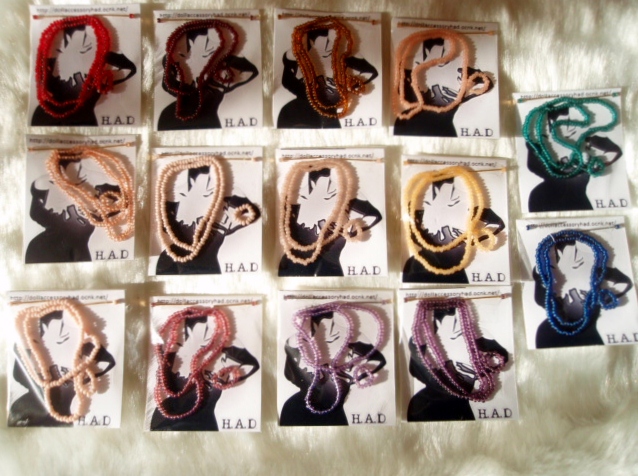 アフリカンカラーのセットで、伸びない糸のネックレスですが、糸を二重にしているので、切れにくいと思います。
