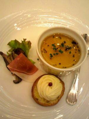 ・生ハムとキノコ添えて フォワグラの茶碗蒸し仕立て カマンベールチーズのムース