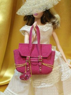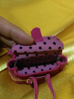 表は三段にチェーンが付いています。 裏はシンプルにフリンジのみが 付いています。 チャームは留め金が付いているので 取り外し可能です。 裏地はピンク地にブラックドットです。 |