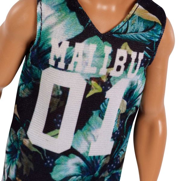 ケンファッショニスタドールがクールで個性的な トレンドファッションで新登場!マリブの文字とナンバーが入った トロピカル柄のタンクトップは夏にもピッタリ。。 グレーのカジュアルのスウェットパンツも、赤がまぶしいスニーカーもおしゃれ。