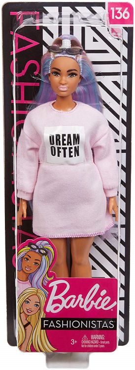 Barbie doll has a curvier body type than the original and wears a pink sweatshirt dress with the message "dream often."