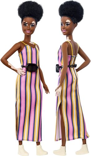 Barbie doll has a more petite body than the original and has vitiligo areas on her face, neck and hands.