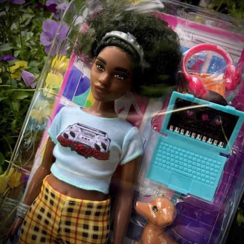 バービー ライラ人形は、チェック柄のパンツ、クールなグラフィック T シャツ、黒のコンバット ブーツを着たロッカーシックです。スタッズ付きのヘッドバンドと同じブレスレットが彼女のおしゃれを完成させます。愛らしいペットの子犬と、バックパック、ラップトップ、ヘッドフォン、レコードなどの物語を伝えるアクセサリーがあれば、子供たちは彼女のサウンド エンジニアとしての 1 日を楽しむことができます。