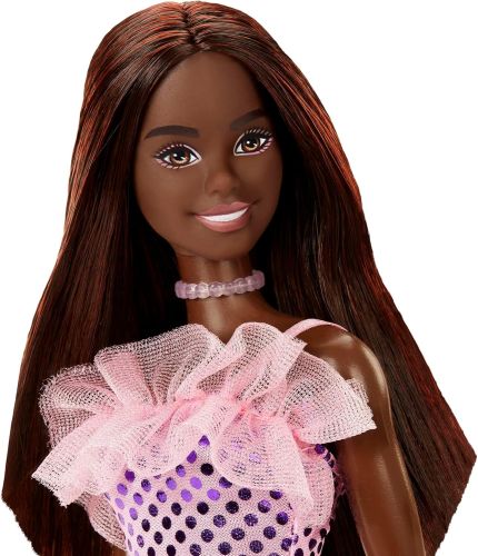 メタリックなディテールで完全に装飾されたバービー人形のピンクドレスは、どんな夜のパーティーにもぴったりです!