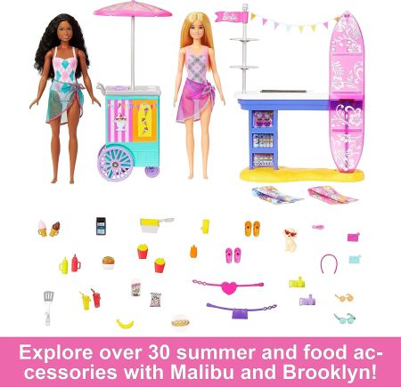 アイテムを備えたこのバービーのプレイセットは、夏の楽しみに満ちています。