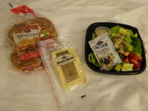 朝食はゴマのパン チーズ(胡椒いりでおいしい) それにイチゴが入ったサラダです