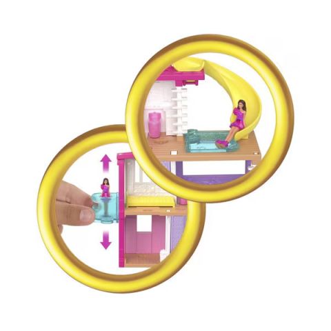 白、紫、ピンクの壁が特徴的なドリームハウスにはミニバービーランドシリーズのドールを固定できる