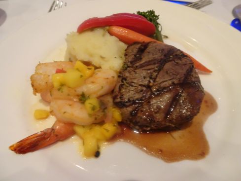 左がベジタリアン 右が一般のステーキ シュリンプソテー マッシュポテト 甘い人参とパプリカ