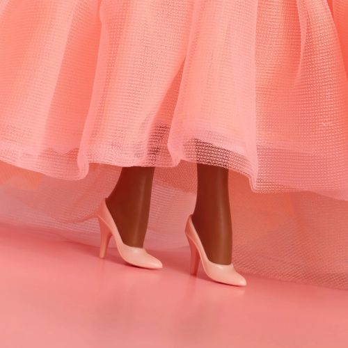 きらめくクリーム色のボディスと床まで流れるボリュームのあるフリルのピーチスカートが特徴のバービー人形は、