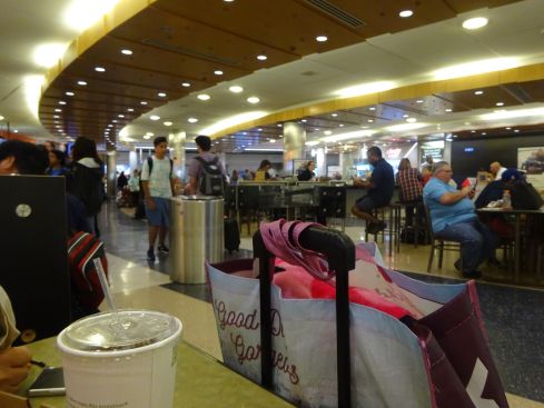 63番ゲイトに向かいます 夏休みなのでチェックインカウンターやセキュリティーチェックも混んでいます ここで私がやらかしました! 胸のところに万歩計をつけていたことを忘れていました。 来るときも装着していたのに。。。。です 体中をゆっくりチェックされます 背中のお肉もです はぢかちぃ〜〜〜 万歩計はBarbieのロゴ入りなので持って行かれたときはドキドキしました。 戻ってこないので 今度はハラハラしていると 夫がX線検査にかかっているだけだから と言って見に行ってくれました それまでは泣きそうに 「もういい! もういい!」と 駄々をこねていた私です。が 夫が手に持ってきてくれた時は もぉう ニンマリなのです 嬉しかったです。\(^o^)/ ありがとう♥