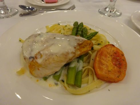 チキンソテー パスタとアスパラ トマト添え パスタとクリームソースで頂きます