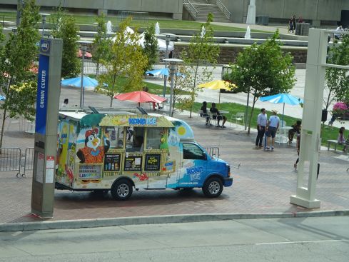 通りの向こうにかわいいキッチンカーが出ています アイスクリーム屋さんでしょうね