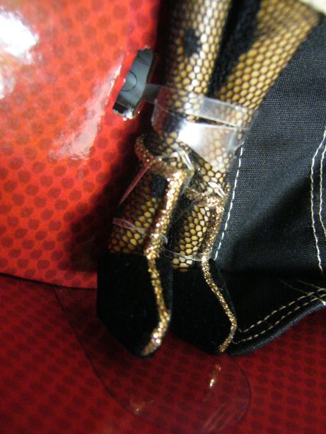 シャープな白ステッチ、そして金ボタンが特徴です。特大のリボン結びが驚くべきシルエットを作り出す一方、