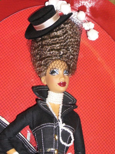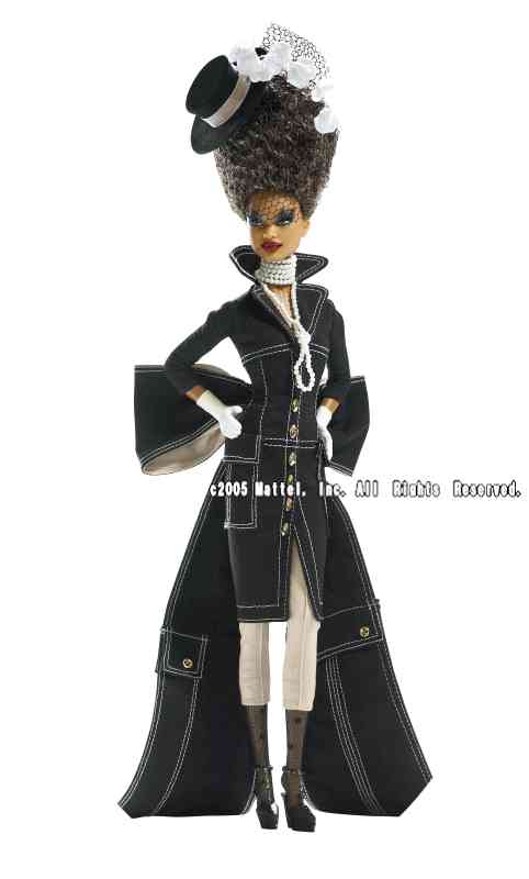 パッパー・バービーが身に着けるのは美しい仕立ての黒いコートドレスー大きく立てた襟、