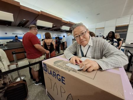 夫はスーツケース2個の上に段ボールを置いて押してあるきます
