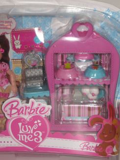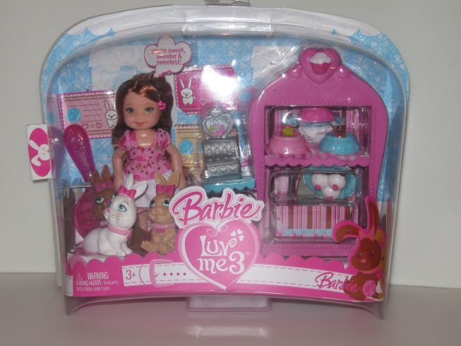 バニーが3匹とスイーツ(バニーのための)ショップ遊びの小物がついています