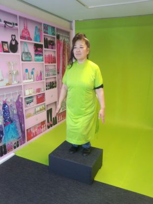 前にあるスクリーンのドレスに合うようにポーズをしてもらいます