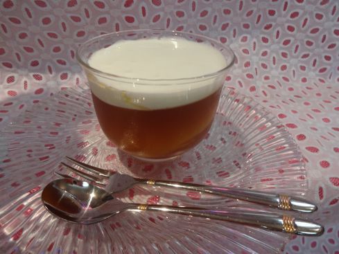 | 本日のスィーツは アールグレーのジュレ! 中に桃を閉じ込めて 生クリームの泡で 見た目はまるで ビールのように仕上げてみました |