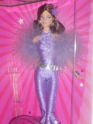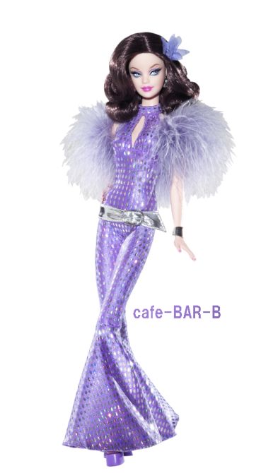 ステキなパープルのジャンプスーツに身を包んだバービー、ベルトとベルボトムがアクセントです。