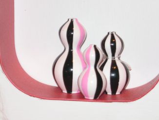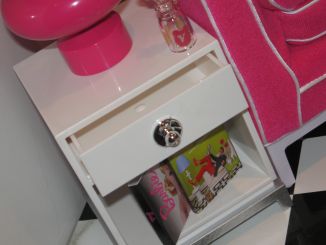 サイドテーブル、ランプ、ファンキーな壺、トレイ、バービーシルエットの鏡は全て白、黒、ピンクで統一