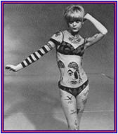 Go-Goダンサーに扮したゴールディが身に着けていたチェックのビキニと、コスチュームの一部として施された風変わりな