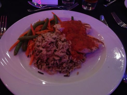 一般の方は 胸肉のローズマリー入りトマトソテー それにワイルドライス いんげんと人参が添えてあります