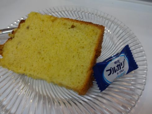| 今日のスィーツは バナナシフォンケーキ バナナの色止めに使ったレモンが 効いておいしいのです (^^) |