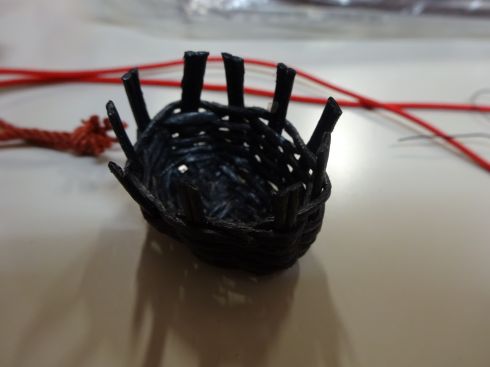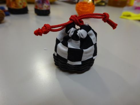 黒のかごに市松 赤の色で引き締めました。
