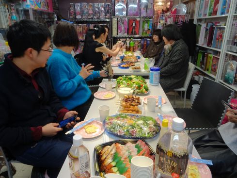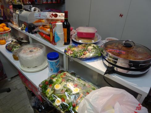 | サラダ オードブル ハンバーグ ふろふき大根 ゆず味噌のせ 山芋の鉄板焼き シフォンケーキ それに出前のお寿司とピザ やきとりがテーブルに並び 差し入れのシャンパンを飲んで 大盛り上がりです\(^o^)/