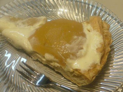 | 今日のスィーツは 洋ナシのパイです クリームをきわどく柔らかくしたかったのですが カットしたら かなり溶け溶けで フィリングは固めがいいと 反省・・・ です。 |