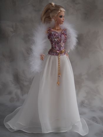 作品は、ドレス(ワンピース)、手袋、 ペチコート、イヤリング、ネックレス、 チェーンベルト、鳥羽根ショールです。