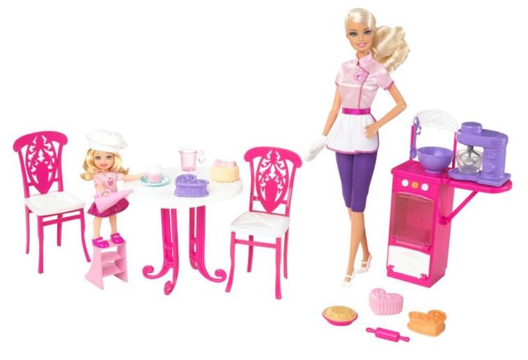 パティシエセットはバービーとチェルシーちゃん、テーブルとイス2脚、オーブンや小物もたくさんついてお得!