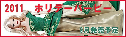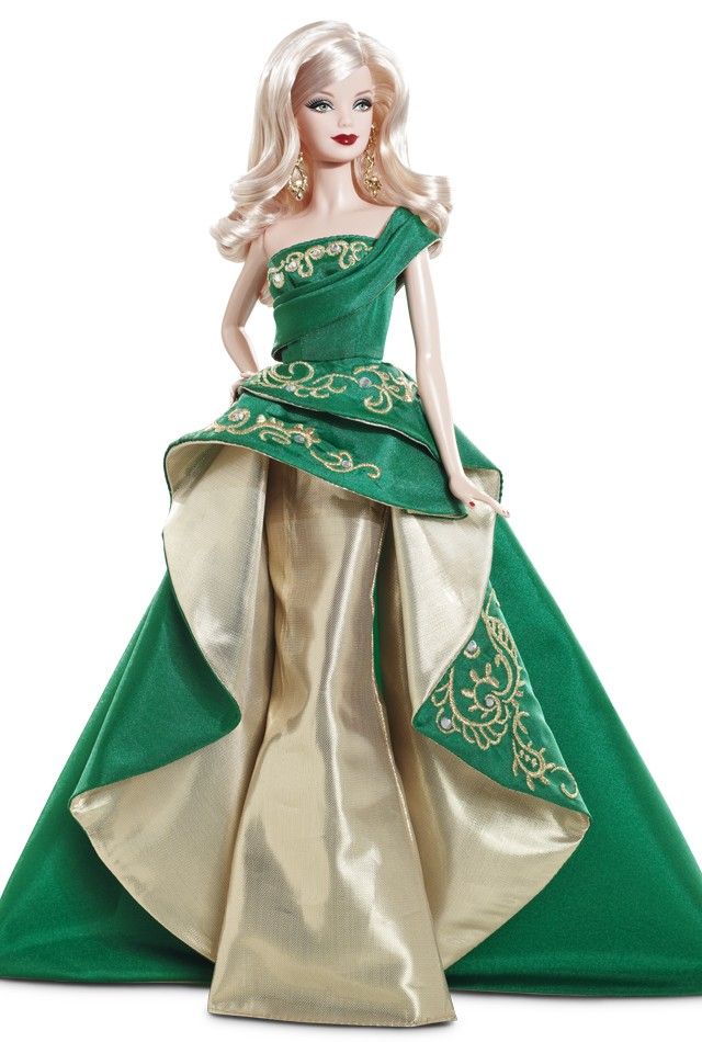 金刺繍が施された床までの長さがある緑のロングガウンをまとったバービーは